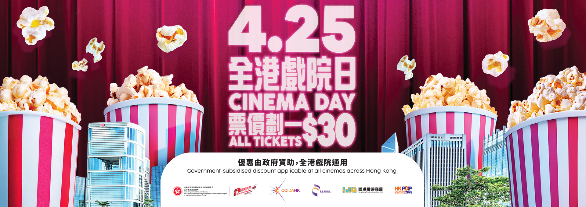 HKTA, with funding support from the Cultural and Creative Industries Development Agency (CCIDA) of the Culture, Sports and Tourism Bureau (CSTB) and the Film Development Fund, is pleased to announce the return of the Cinema Day. This year's event is also one of the supporting programmes of Hong Kong Pop Culture Festival 2026. On 25 April, screenings at all 52 commercial cinemas across Hong Kong, regardless of the screening format or cinema type, including VIP Houses, will be available at a flat ticket price of $30. The initiative allows the public to enjoy a wide range of films and cinema experiences at an exceptional value. For details, please refer to the following: